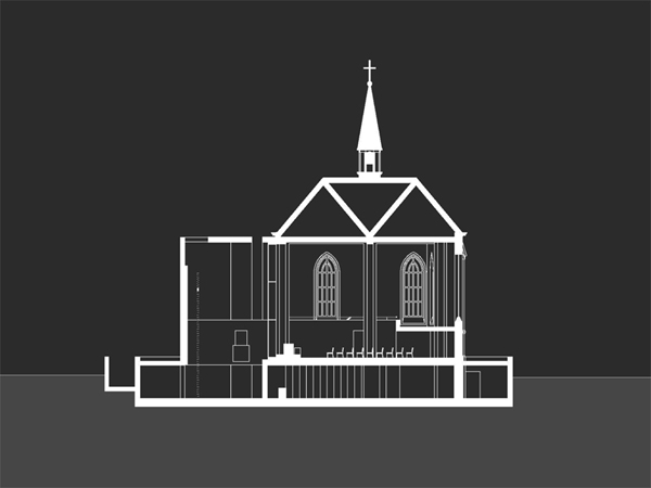 Durch die Zerstörung des nördlichen Baublockes und den Wegfall der westlichen Joche ist eine völlig veränderte und unklare städteräumliche Situation entstanden. Aus der Kirche als raumbildendes Element ist ein Element im Raum geworden. Die Zerstörung der Kirche hat zusätzlich eine Änderung der Proportionen und Richtungen des Kirchenraumes verursacht. Mit diesem Entwurf wird durch einen dritten Raum, einerseits in West-Ost Richtung den ursprünglichen Kirchenraum angedeutet, anderseits die beiden Plätze nördlich und südlich der Kirche verbunden. Hier erspürt der Passant die Bedeutung des Ortes. Stadtraum und Kirchenraum überkreuzen sich. Um die einstmalige Größe der Kirche nachempfinden zu können, wird die im Laufe des Wiederaufbaus eingefügte Westwand der Kirche durch eine Verglasung ersetzt. Die Gestaltung des außenliegenden Raumes ermöglicht Freiluftmessen oder Vorträge.