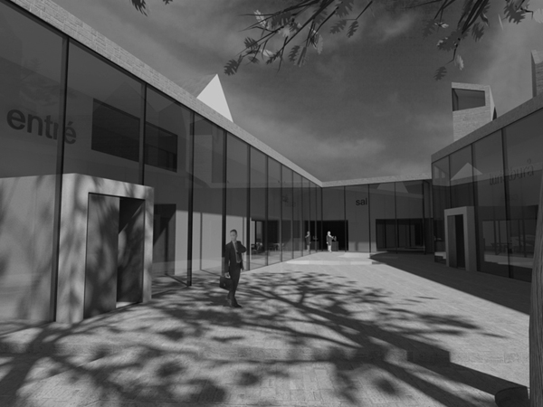 Der 'Klostergård' mit Kreuzgang, den es im Mittelalter hinter der Apsis tatsächlich gegeben hat, wird neu interpretiert. Ein von einem Kreuzgang umschlossenes Atrium bildet, wie bei romanischen Sakralbauten nicht unüblich, den neuen Eingangsbereich zum Dom. Das Besucherzentrum ist eher ein kleinschaliger Städtebau als ein Einzelbaukörper und passt sich somit an Lunds mittelalterliche Stadtstruktur an. Ein Leuchtturm bildet den städtebaulichen Schwerpunkt, er ragt wie ein Campanile über den neuen Platz hinaus und beleuchtet den Dom nach der Dämmerung. Um die historische Bedeutung des Platzes zu unterstreichen, könnten die Fundamente eines historischen Tores, die sich unter dem Atrium befinden sollten, freigelegt werden. Der klimatisierte, doppelgeschossige Kreuzgang verbindet das Atrium mit den Hauptfunktionen, er bietet Möglichkeit zum Verweilen und Platz für Ausstellungen.